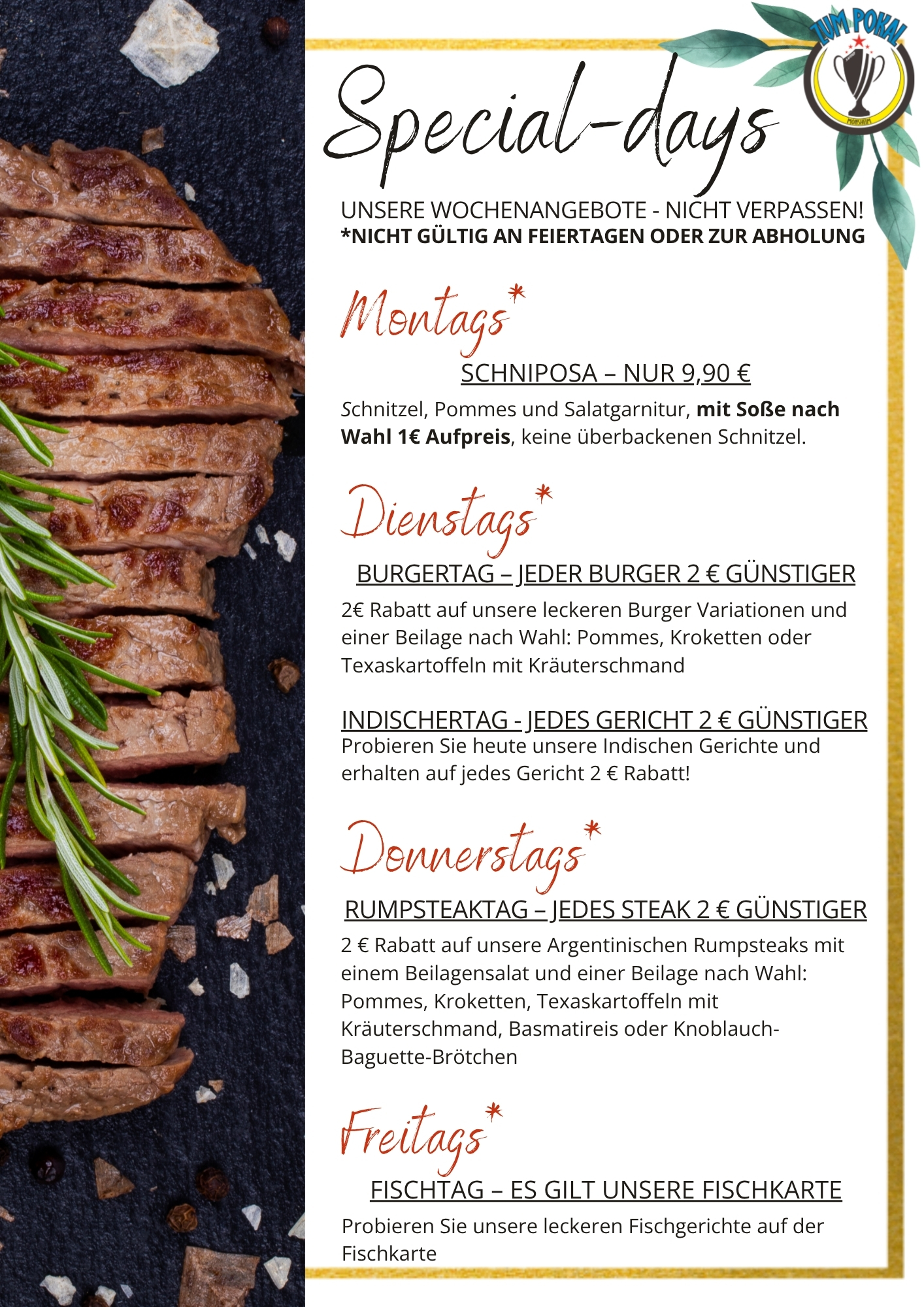 Dieses Angebot gilt nicht für überbackene Schnitzel und auch nicht an Feiertagen.